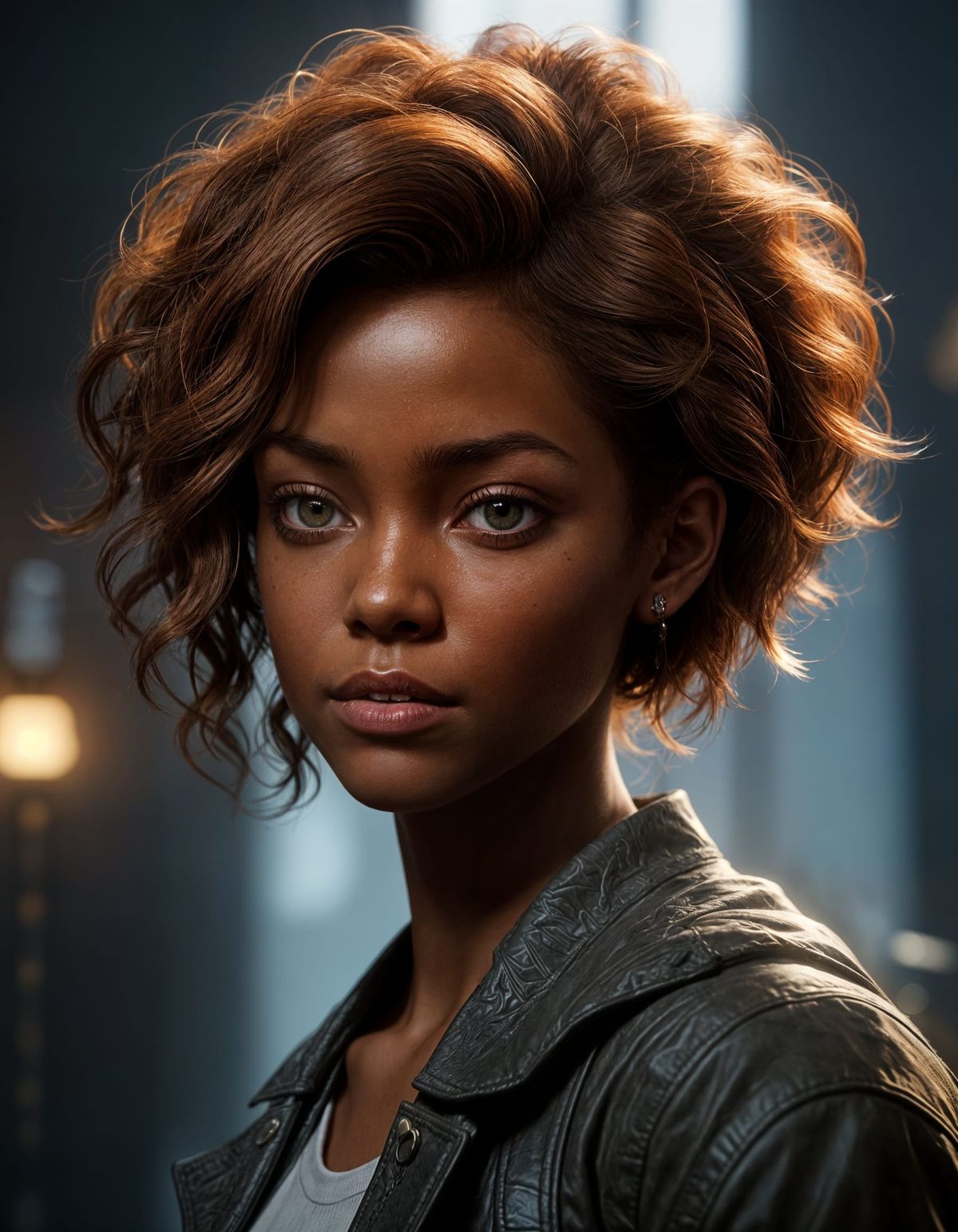 A striking picture of a young African American woman with auburn hair, depicted as a determined detective. This 8k resolution portrait features dynamic lighting and intricate details, rendered in a 3D cinematic style.