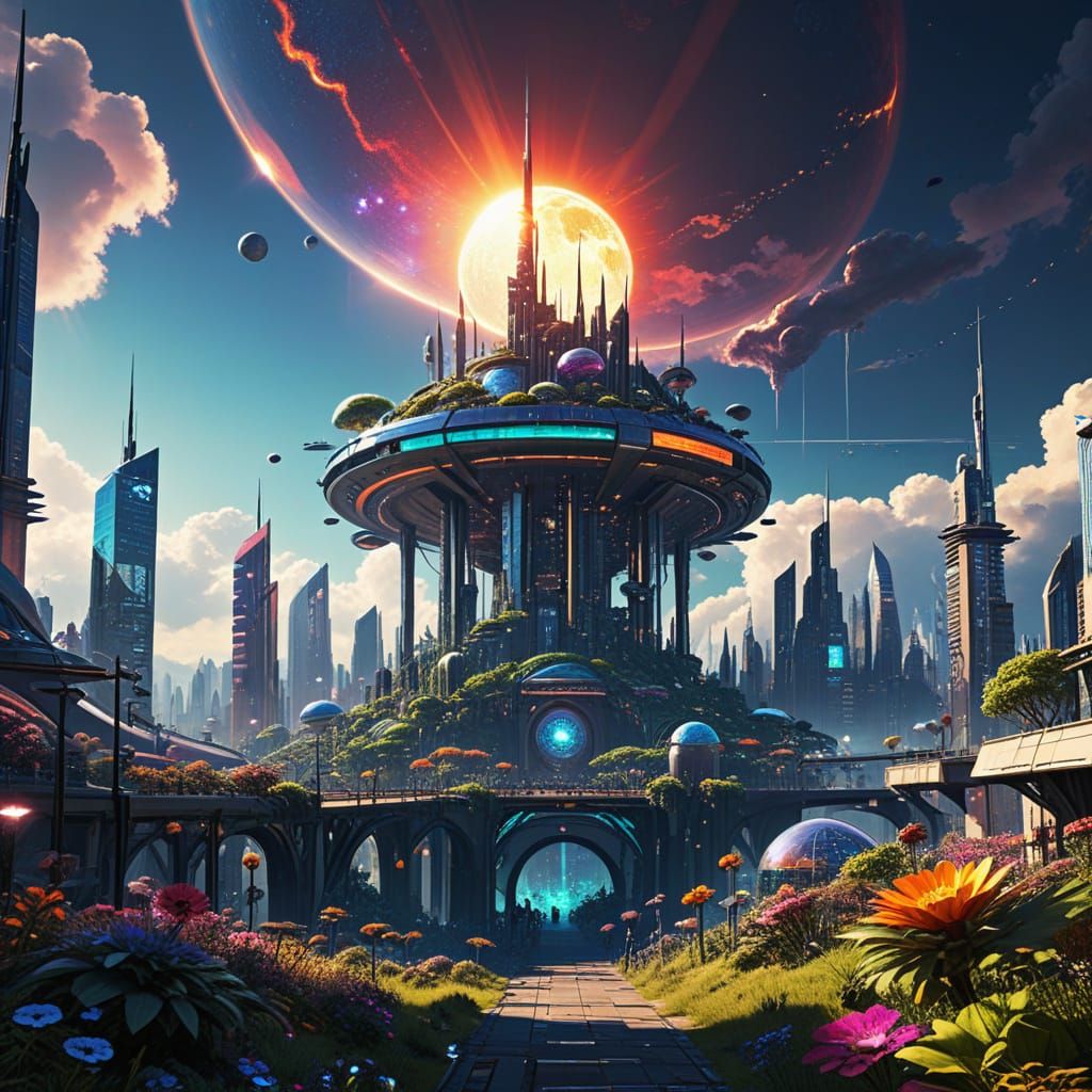 A vibrant image of a solar punk city blending nature and technology. The cityscape evokes a utopian vision with fantastical and futuristic elements in a science fiction setting.