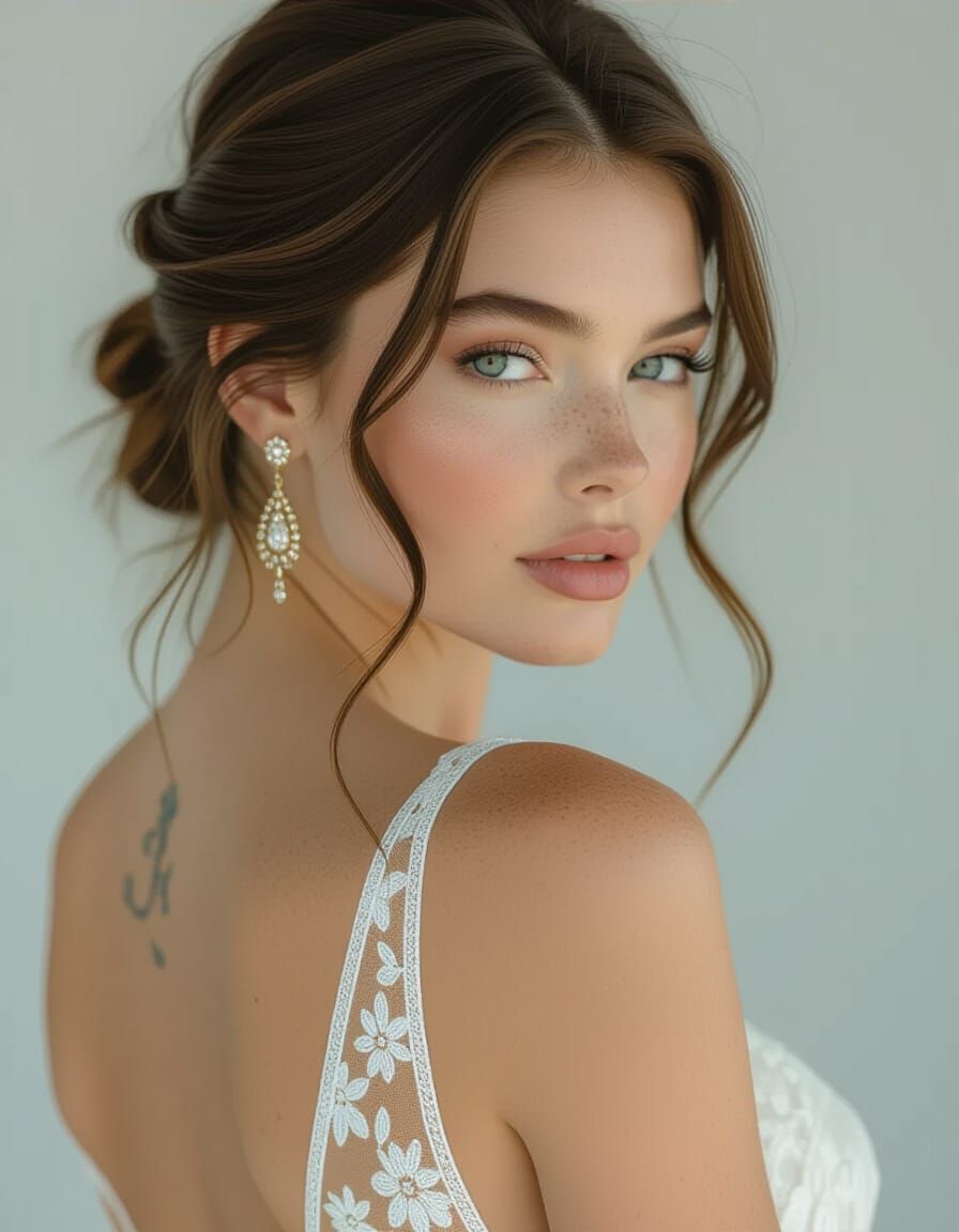 This image shows a young woman in elegant attire glancing back over her shoulder. Realistic skin texture, subtle freckles, and silky hair are rendered with cinematic color grading and photorealistic detail.