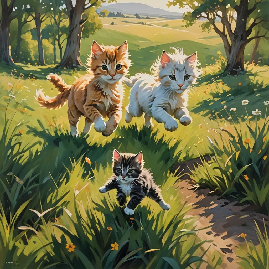 A vibrant oil painting of a kitten and pony playing in a meadow. The impressionistic style features visible brushstrokes, soft textures, and warm golden hour lighting to create an idyllic scene.