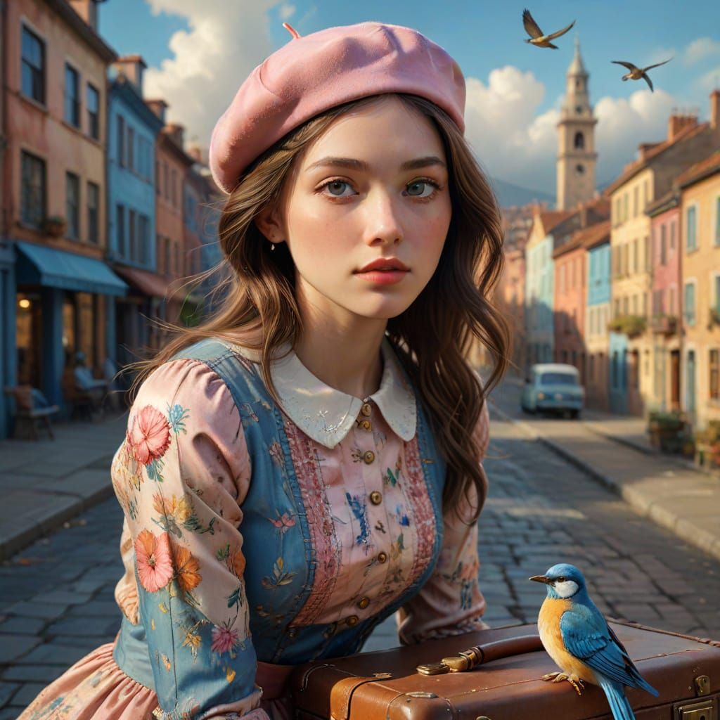 This image shows a girl sitting on a vintage suitcase in a whimsical cityscape. She wears a patchwork dress and beret, surrounded by blue birds in a vibrant, colorful splash art style.