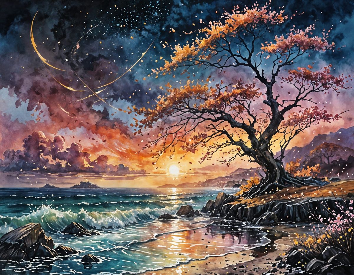 This image shows a dramatic and colorful sunset with a mystical atmosphere, featuring a glowing sky with swirling colors and constellations, set against a backdrop of autumnal hues and receding waters.