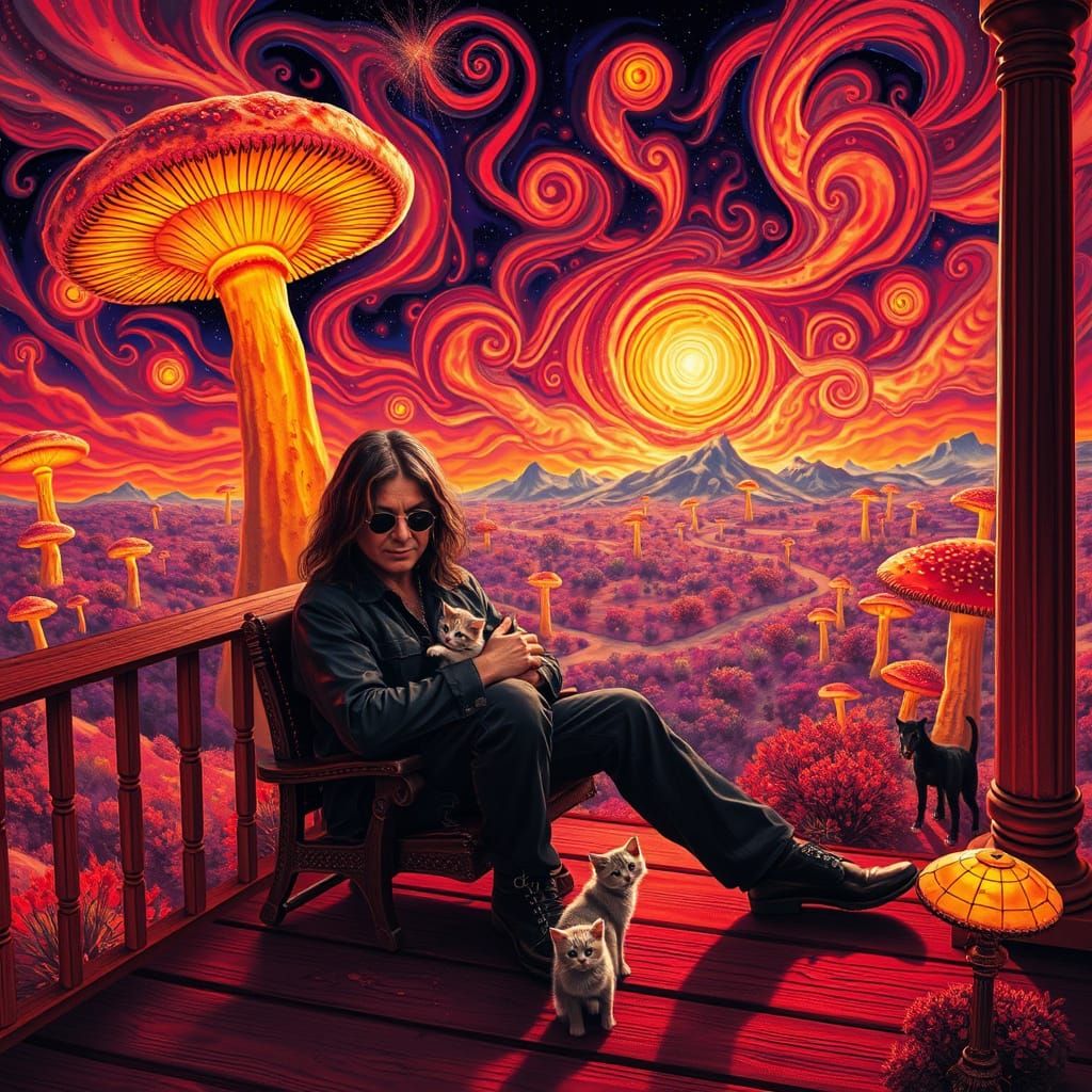 A striking picture of Ozzy Osbourne on a porch, holding kittens against a surreal landscape. The image blends gritty realism with psychedelic art, featuring bold colors and shimmering accents.