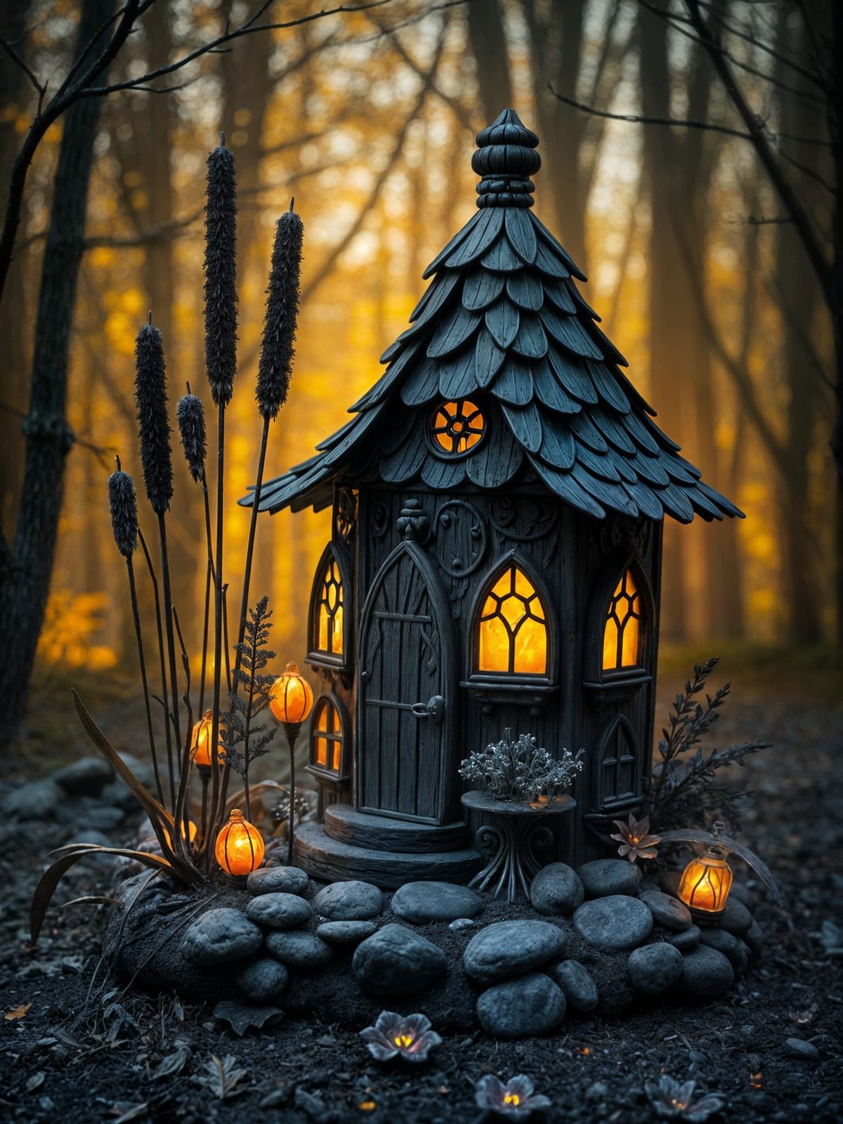 A Victorian fairy cottage crafted from dark flora stands amidst an ethereal forest. The image evokes a dark and enchanting atmosphere with fractal elements and a glowing backdrop.