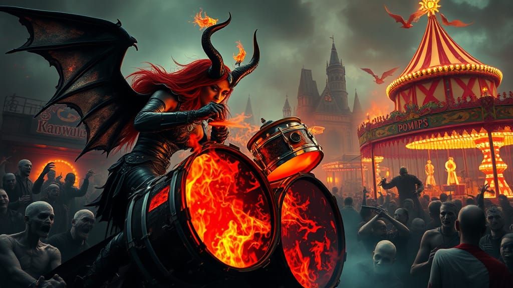 This image shows a female demon drummer surrounded by zombies and spirits, playing a heavy metal drumkit with two massive kick-drums engulfed in flames, amidst a vibrant, hand-painted carnival cityscape with a dark, cinematic style inspired by Ash Thorp and Zdzisław Beksiński.