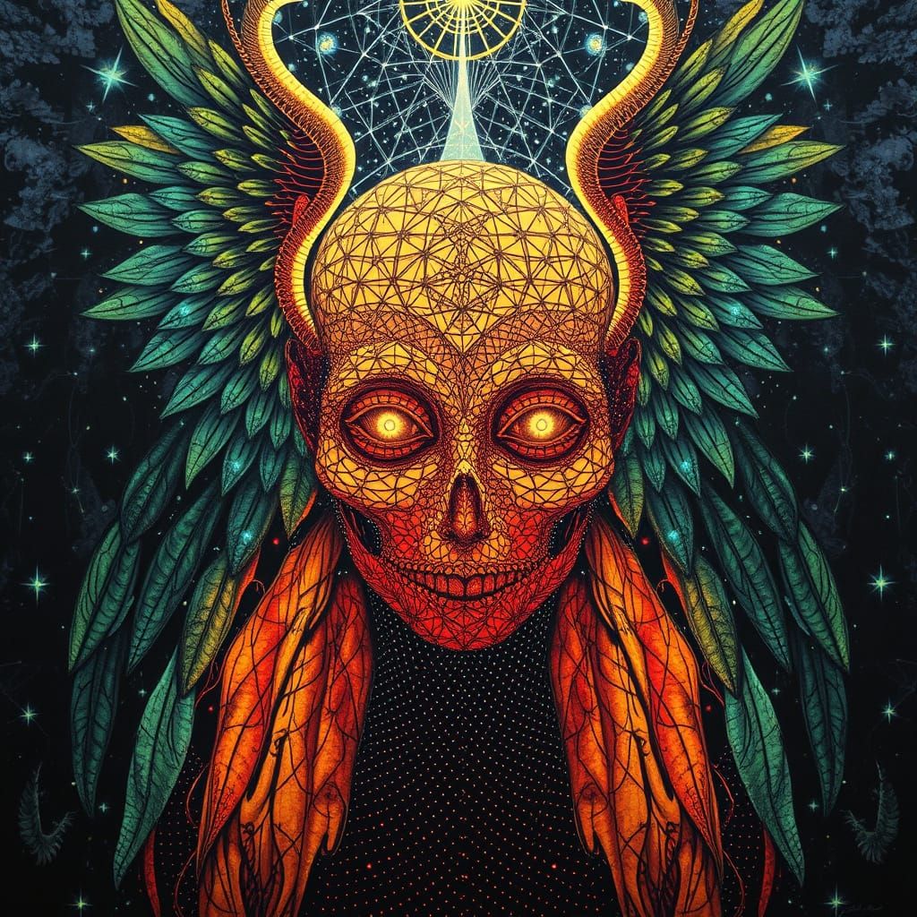 This image shows an angel of death figure emerging in a forest cathedral. The figure is symmetrical, with hunter's eyes and a death stare, set against a cavernous landscape in an electroplated pastel palette.