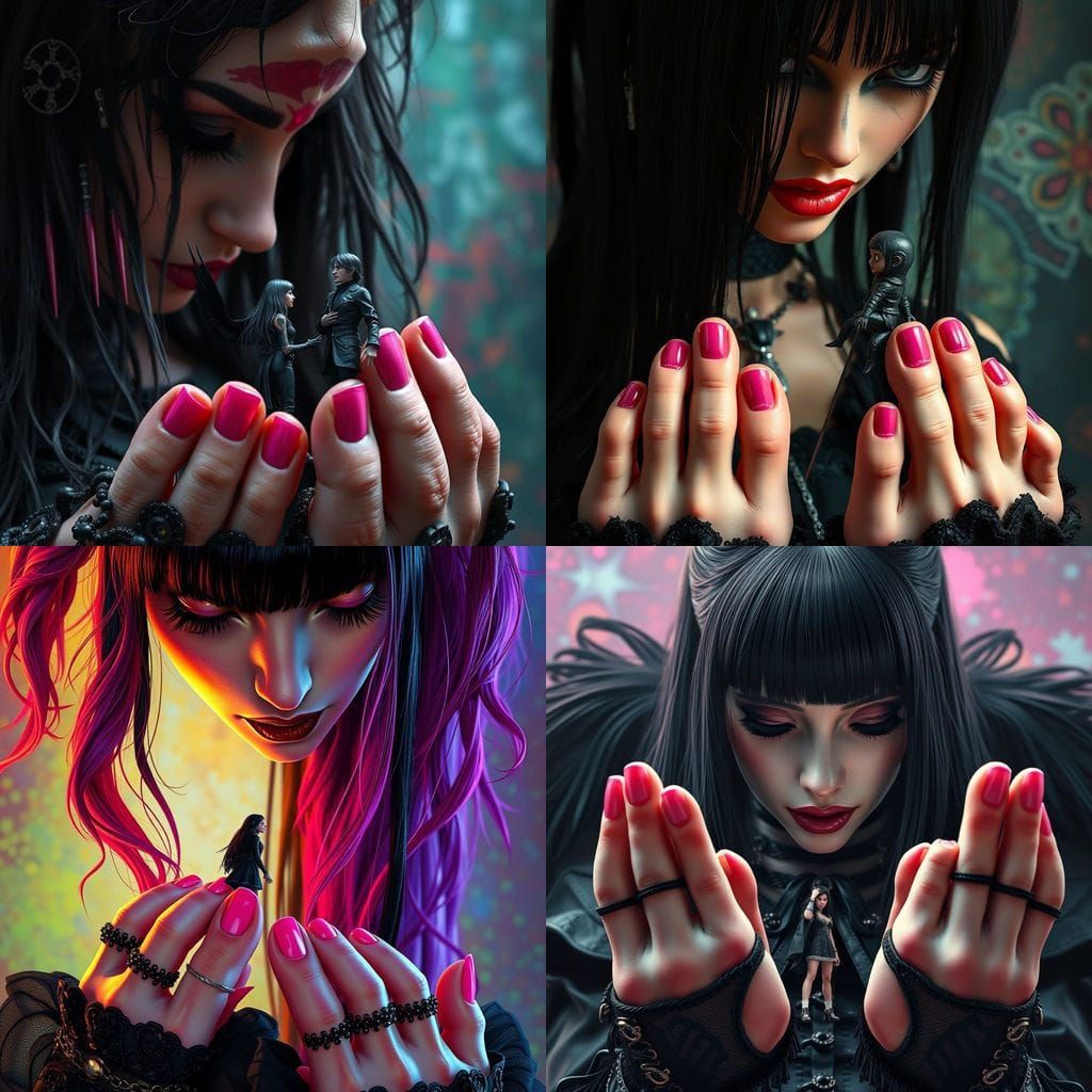This image shows a giant goth woman looking down at a tiny man pinned between her toes. She is wearing black goth clothing and has pink toenails, rendered in a hyperrealistic splash art style.