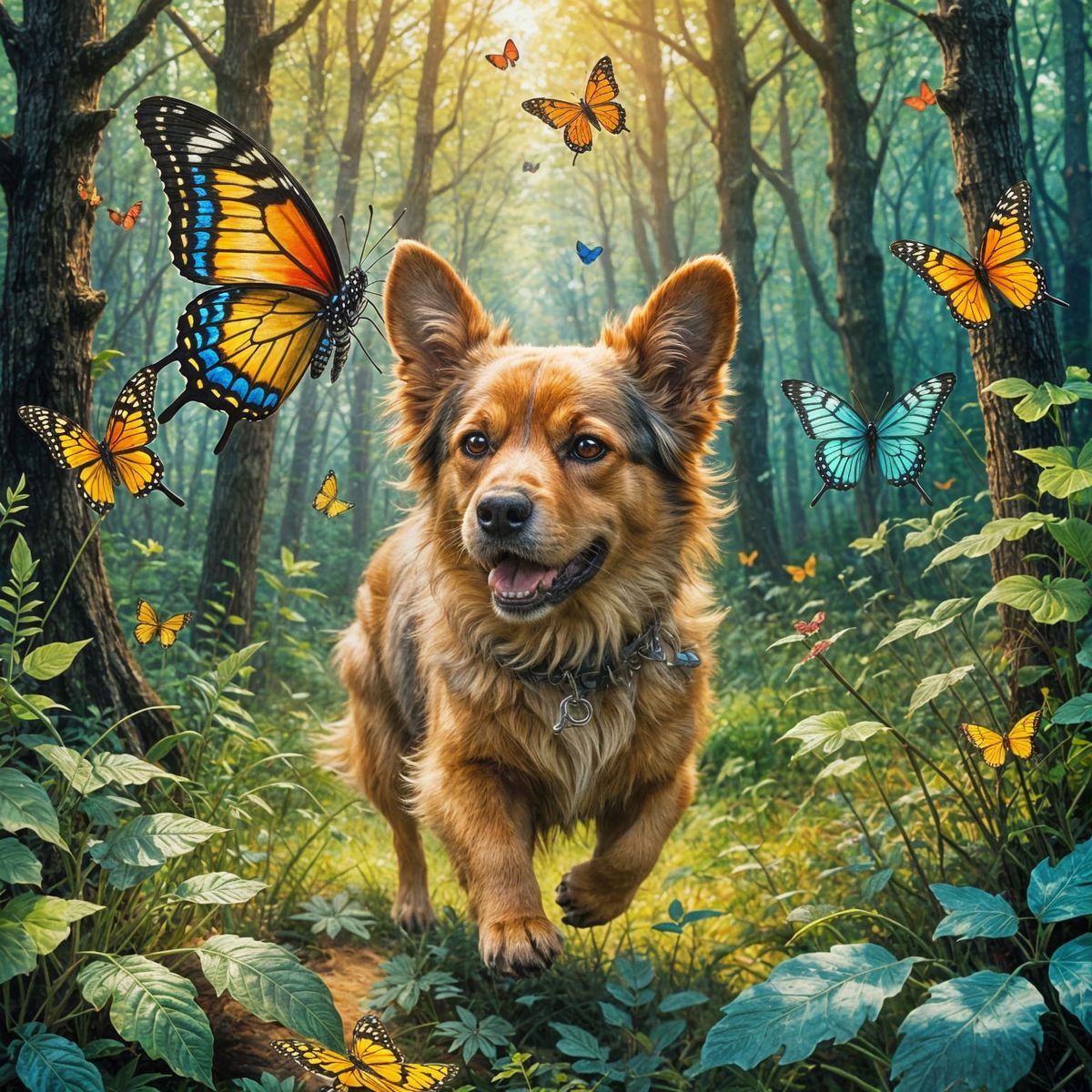 This image shows a dog and a butterfly in a fantastical forest setting. The background has an ethereal, impressionistic and surreal quality, creating a dreamlike atmosphere.