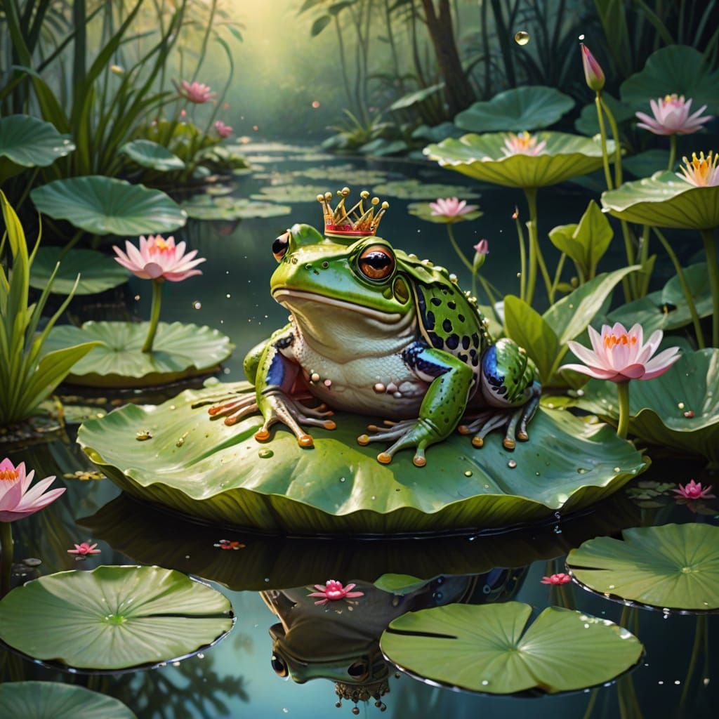 This enchanting image features a delicate watercolor painting of a majestic frog princess, adorned with a crown, sitting serenely on a lilypad in a lush forest pond. Soft, ethereal lighting and intricate details bring the natural surroundings to life, complete with tiny fish, water reflections, and danci...