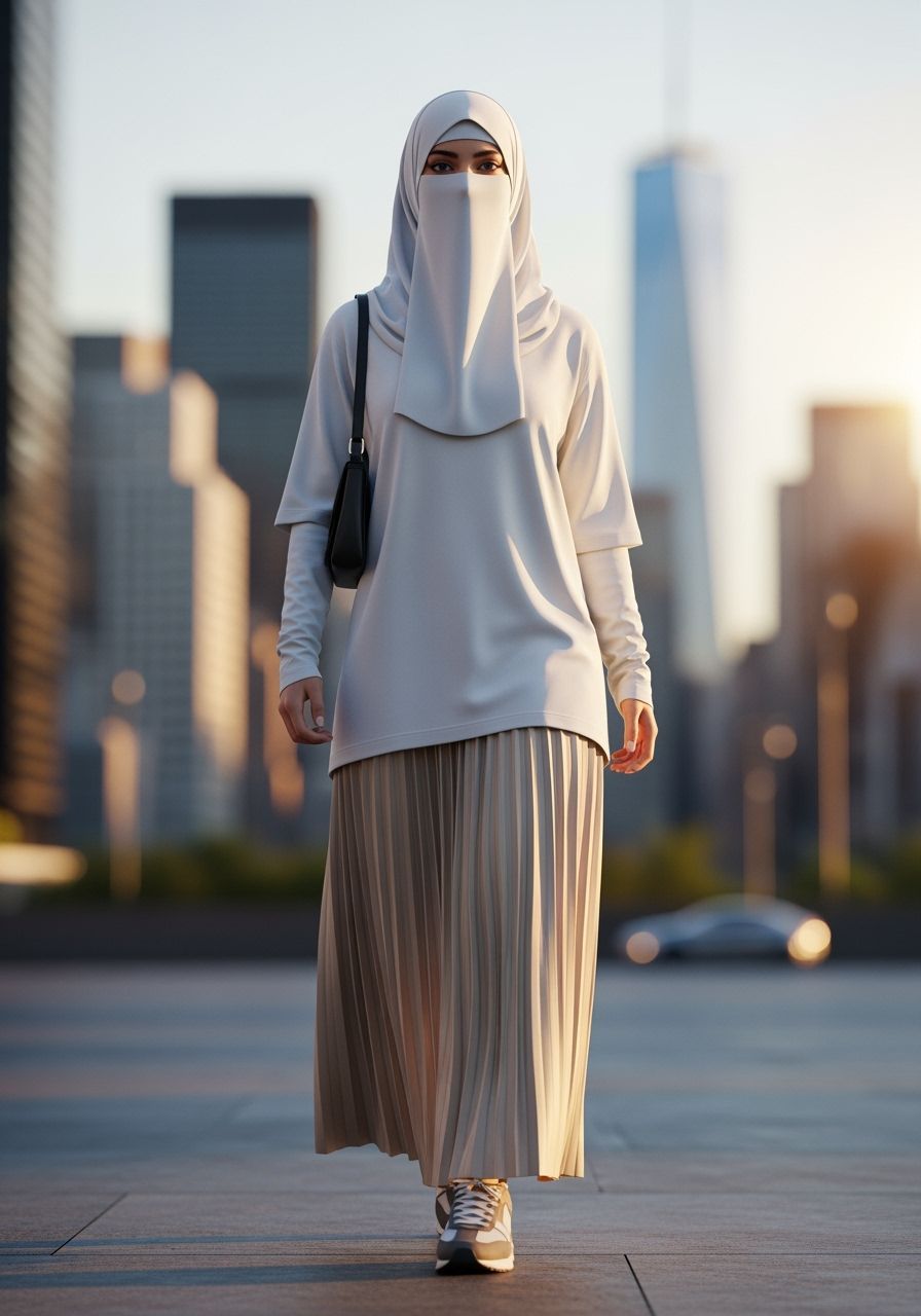 This image shows a beautiful woman in a niqab walking in a modern city. Soft sunlight illuminates the subject, with a blurred cityscape visible in the background. The image exhibits ultra-realistic digital art style.