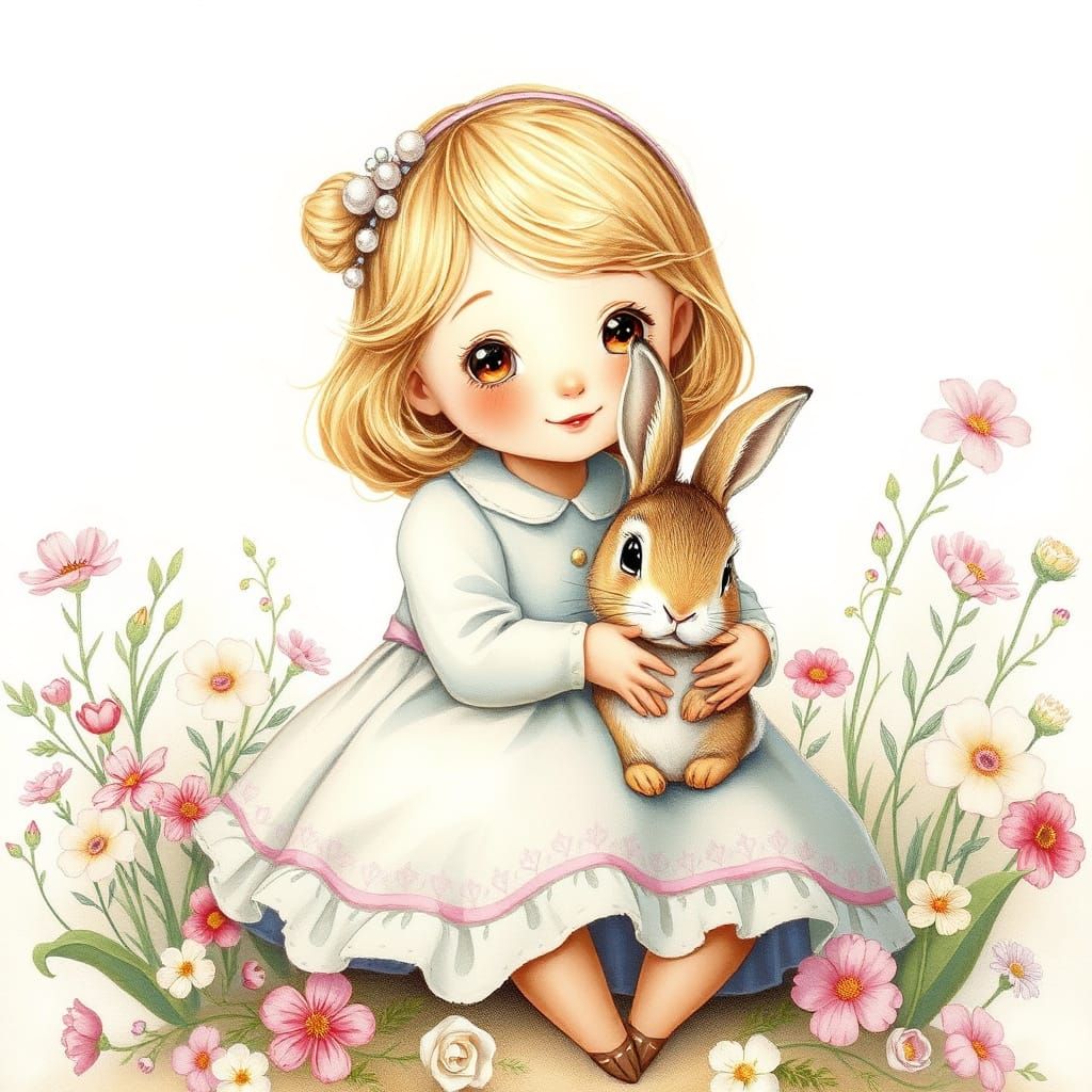 This image shows a young girl with blonde, curly hair, sitting with a big smile, wearing a light pastel rainbow dress, holding a soft Easter bunny. The scene is set in a spring garden with delicate details and a sunny atmosphere, inspired by classic children's book illustrations.