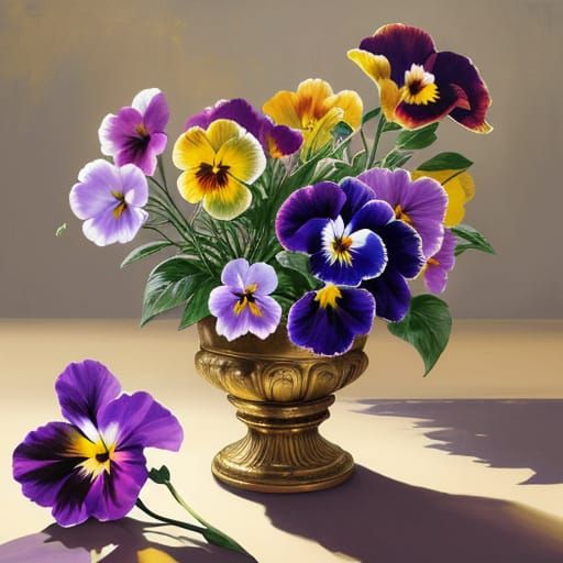 A striking picture of a pansy flower in vibrant, colorful light. The image is rendered as a baroque oil painting with warm light, high contrast, and intricate detail, reminiscent of old master paintings.