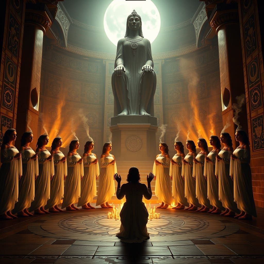 This image depicts a towering obsidian statue of Ishtar overlooking a moonlit temple. Thirteen women stand in a circle around a kneeling high priestess amidst firelight and incense smoke, captured as a vintage film still.