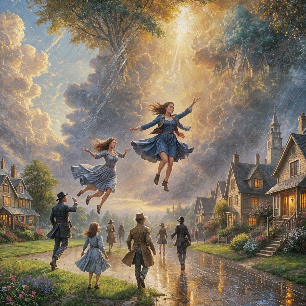 This image shows a vibrant scene of figures emerging into sunlight after a rainstorm. The artwork is rendered in a luminous, idyllic style reminiscent of oil on canvas paintings.