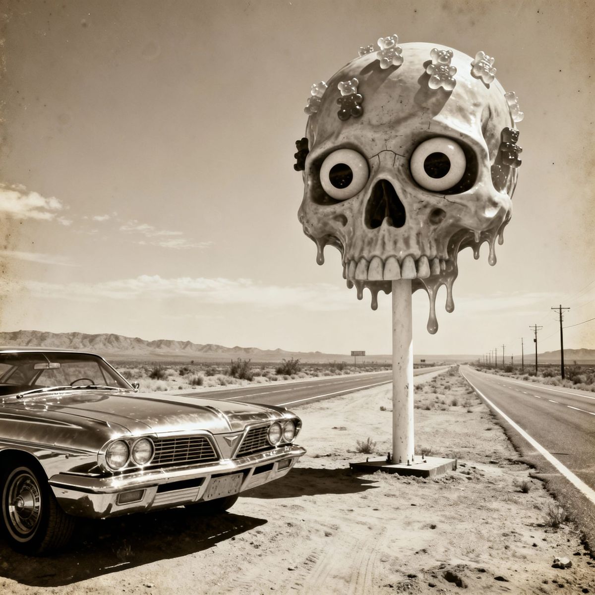 A vintage-style photograph of a bizarre roadside attraction: a giant, melting lollipop resembling a skull with gummy bear eyes on a desert highway. Features a retro car and a sepia-toned, grainy finish.