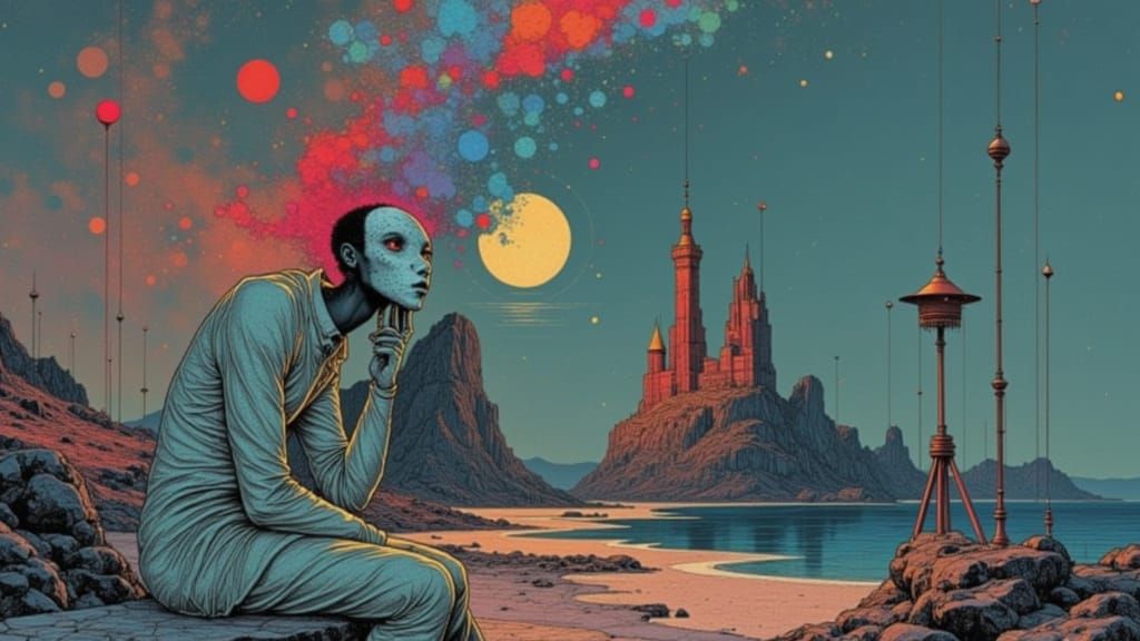 <lora:Akimora:1.0> <lora:Surreal Shine:1.0> <lora:11-11:1.0> <lora:MJ Style:1.0> moebius colored line drawing comic with Otherworldly digital noise and static glitch cyberpunk elements, chemical burn and visual interference, oscillating broadcast towers, analog glitch halos, crystalline servers, mystical ...