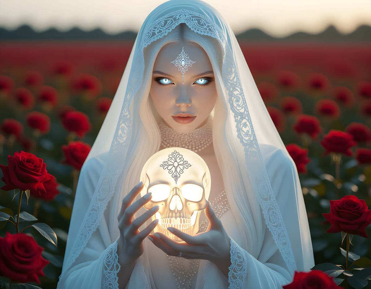 This image shows a striking albino woman with radiant silver eyes in a surreal landscape. She holds a luminous skull amidst petrified trees, illuminated by soft, dynamic lighting in a detailed digital fantasy art style.