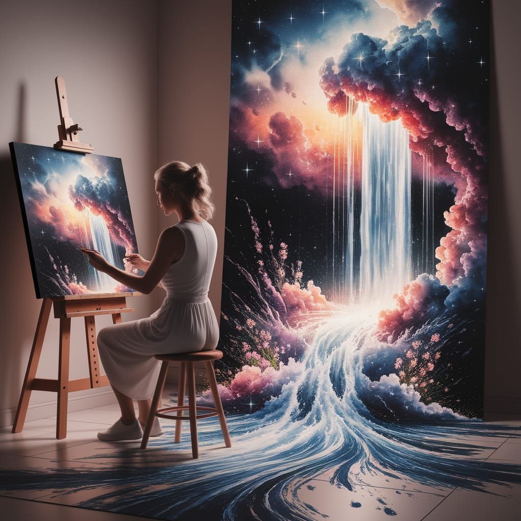 A striking image of an artist working on a cosmic waterfall painting. The artwork dramatically bursts from the canvas, creating a luminous, nebula-hued cascade.