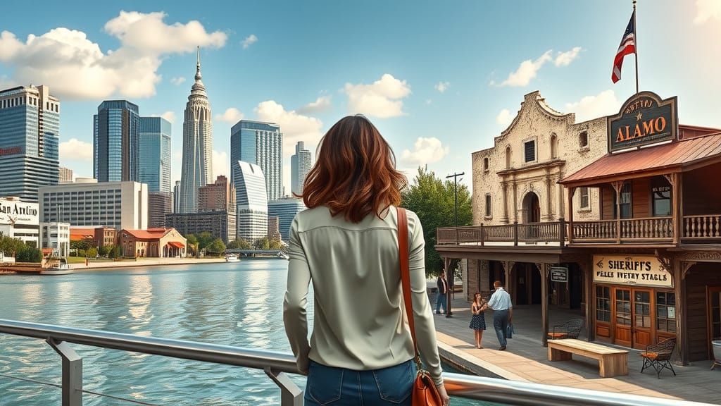 This image shows a woman admiring the San Antonio skyline, which merges modern skyscrapers with an Old West town. The photorealistic scene blends magical realism with intricate details.