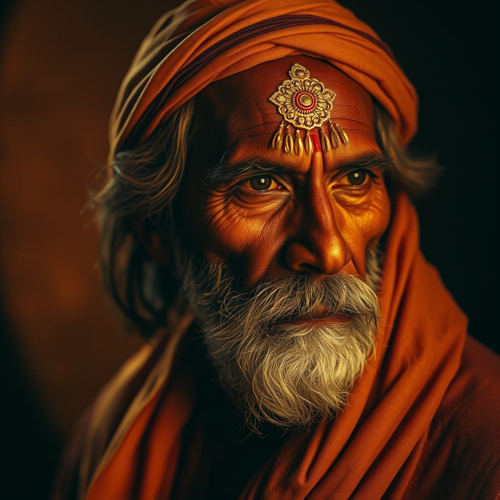 A captivating, high-contrast portrait of a serene Indian mystic, rendered in warm, golden tones with rich accents, evoking timeless wisdom and a contemplative atmosphere. Masterful chiaroscuro and subtle textures create profound depth and dimensionality, with intricate details and triadic colors that see...