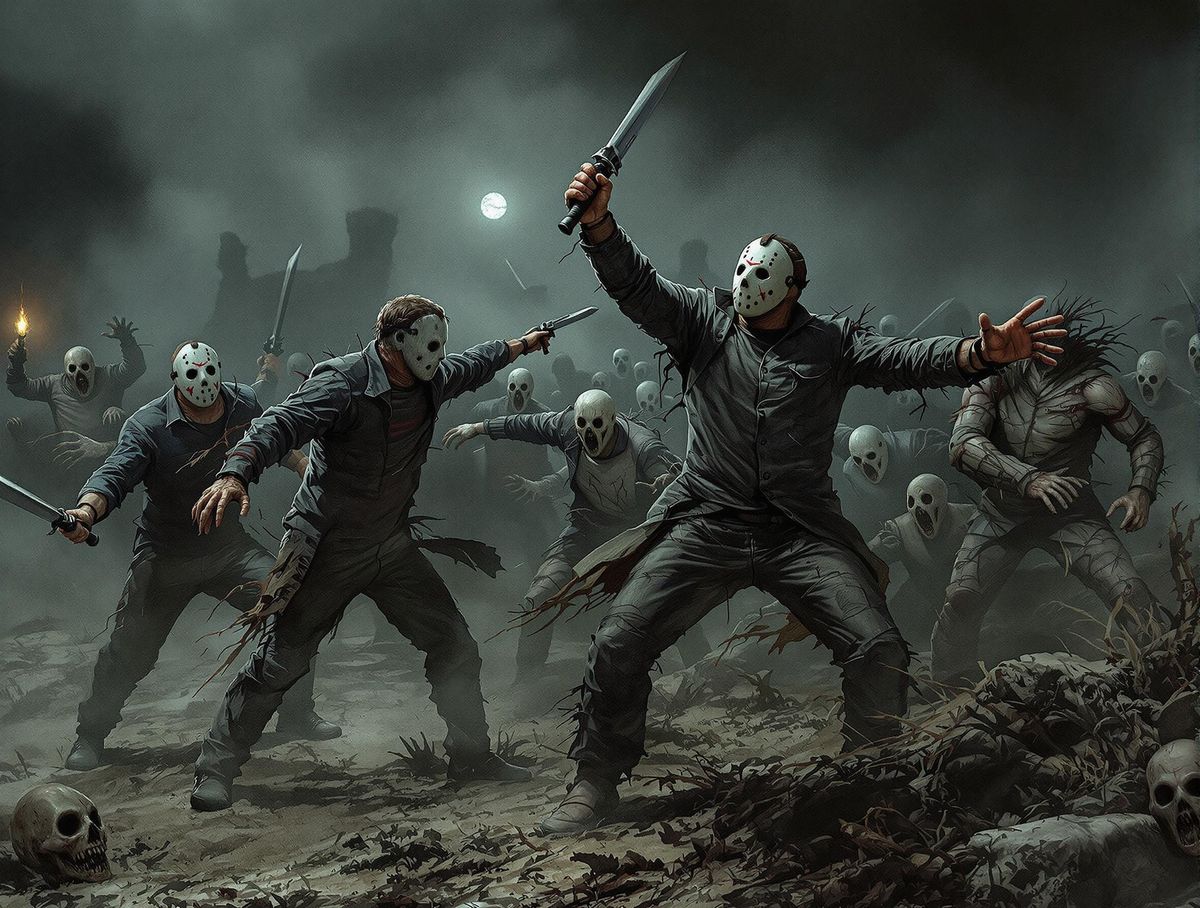 A dramatic image depicts horror icons fighting zombies in a hyperrealistic style. The dark, atmospheric scene is reminiscent of classic etching techniques, with cinematic lighting and intricate details.