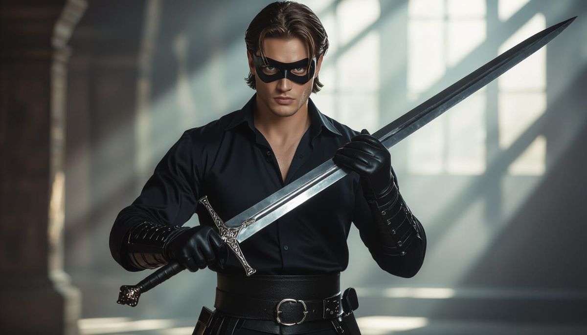 This image shows a handsome young man in modern attire holding a medieval sword, his face partially hidden by a black domino mask. The studio photograph captures a dreamy, ethereal, dark fantasy atmosphere.