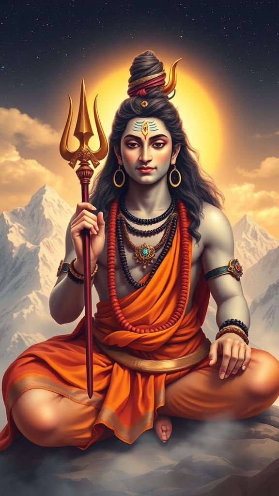 A divine depiction of Lord Shiva meditating on Mount Kailash. The artwork features warm, traditional Indian art tones, a golden aura, and a cosmic backdrop, creating a serene and spiritual atmosphere.