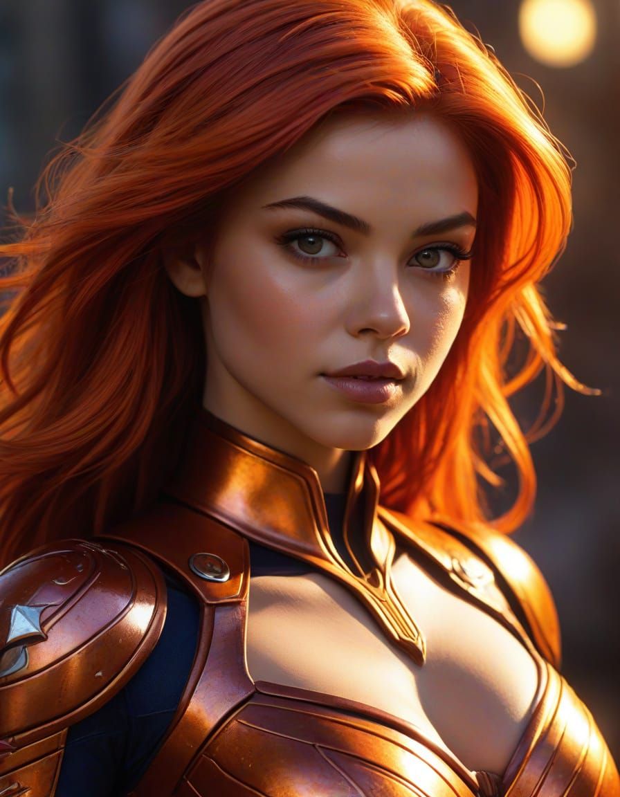 A cinematic portrait of actress India Eisley with orange skin and flaming red hair as alien princess and superheroine Starfire, from DC's Titans.