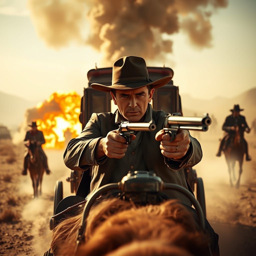 This image depicts James Bond as a rugged cowboy, driving a stagecoach through a dusty Western landscape with explosions and pursuers. Rendered with dramatic lighting and a cinematic style.