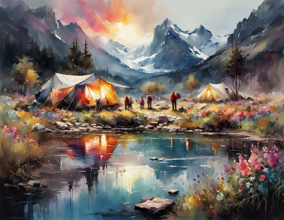 This image shows a vibrant watercolor painting of a campsite nestled in a mountainous landscape. The artwork features spring flowers, a serene lake, and a sunset, rendered with dramatic lighting.