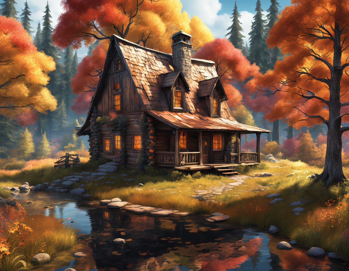 This detailed matte painting showcases a photorealistic autumn scene with an old wooden cabin, a serene pond, and a mix of deciduous and pine trees, rendered in deep, complementary colors.