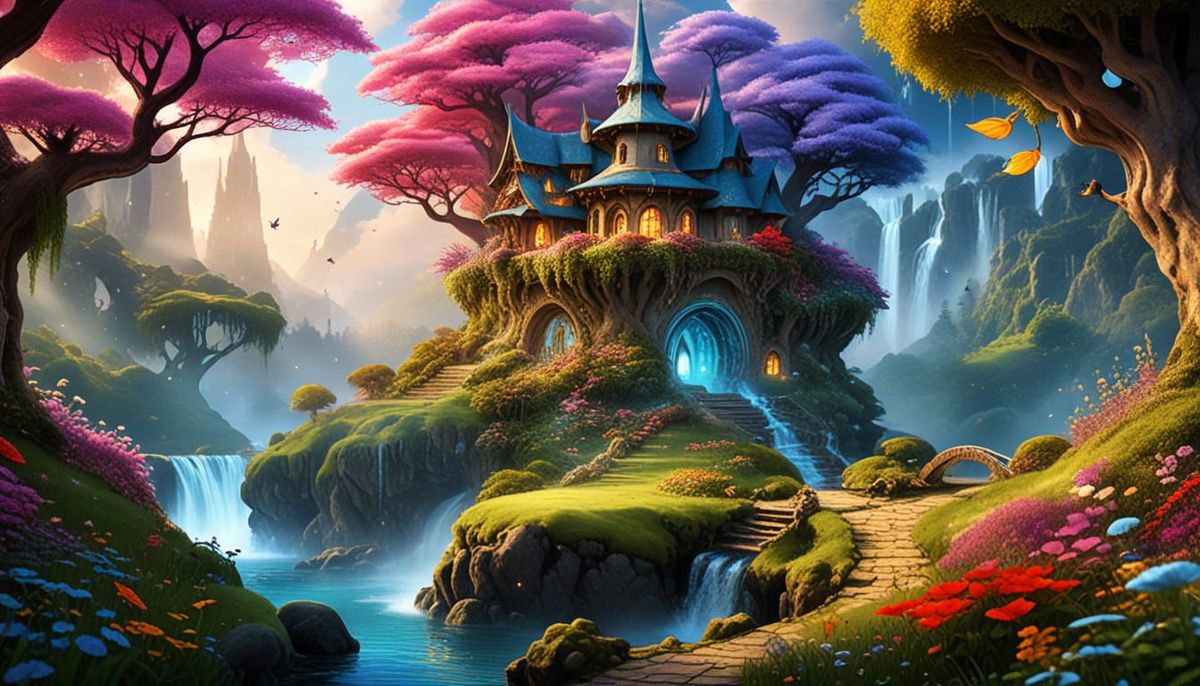 This image depicts a vibrant and magical realm filled with fairies and mystical elements, showcasing a world of wonder and fantasy.