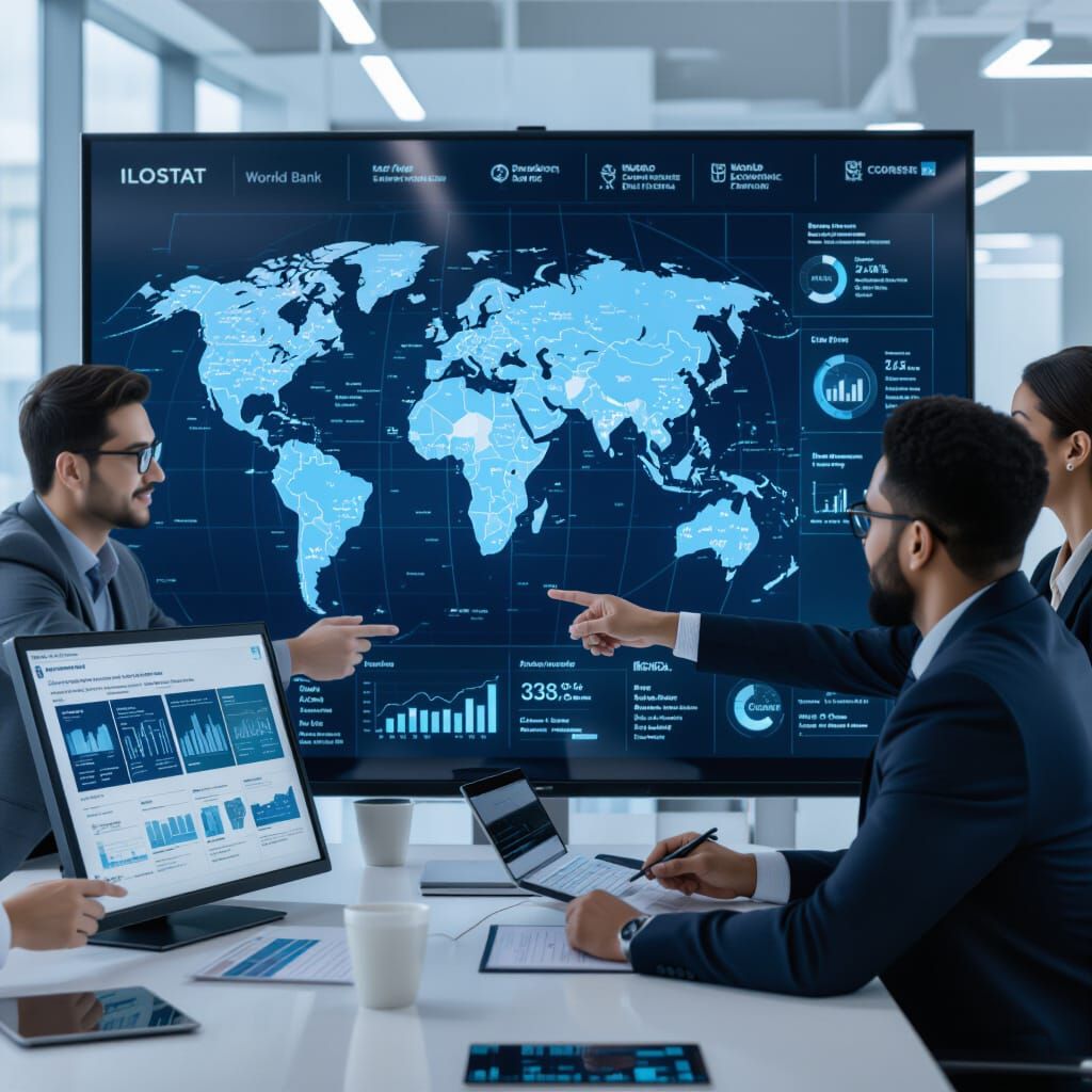This ultra-realistic photograph captures international professionals from around the world collaborating in a high-tech center, analyzing global employment trends on an interactive world map and digital dashboard.