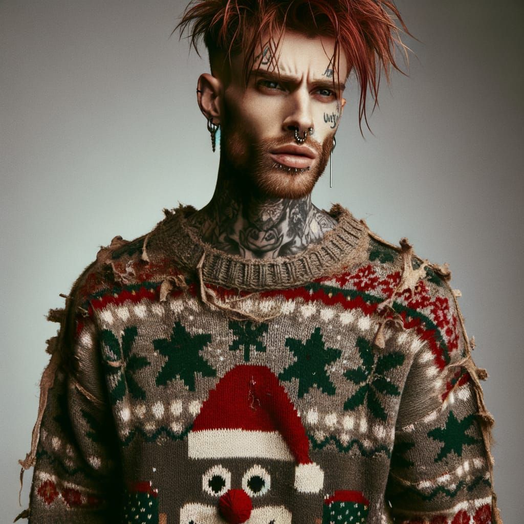 This image shows a gritty, textured portrait of a middle-aged punk man with distressed red hair wearing a vintage, oversized Christmas sweater. The aesthetic is raw and non-photorealistic.