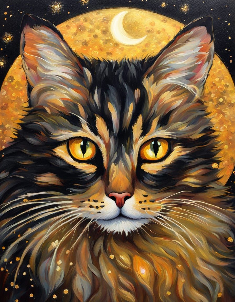 A close-up oil painting of a tortoiseshell cat with shimmering whiskers, sitting in soft, golden light. The artwork is a masterpiece with textured brushstrokes and intricate details, showcasing gold and black hues.