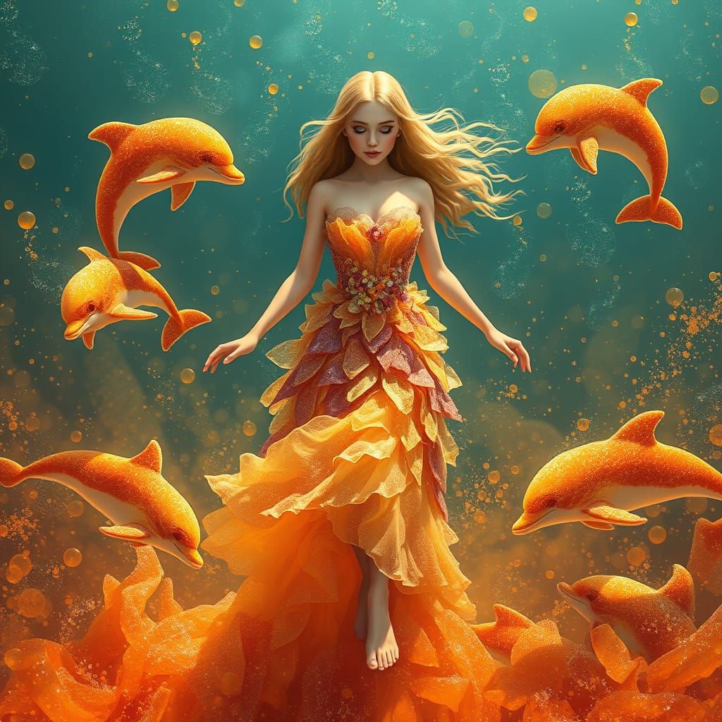 A digital artwork of a young woman with golden hair in a shimmering gown. She glides over a sea of amber soda, surrounded by candy dolphins. The image has a whimsical and vibrant surreal aesthetic.