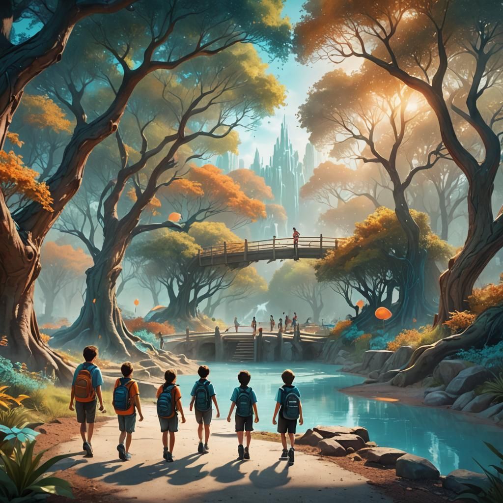 A vibrant digital painting shows children approaching a hidden water park in a misty forest. The fantasy scene is bathed in sunlight, with stylized trees and tropical plants in bright colors.