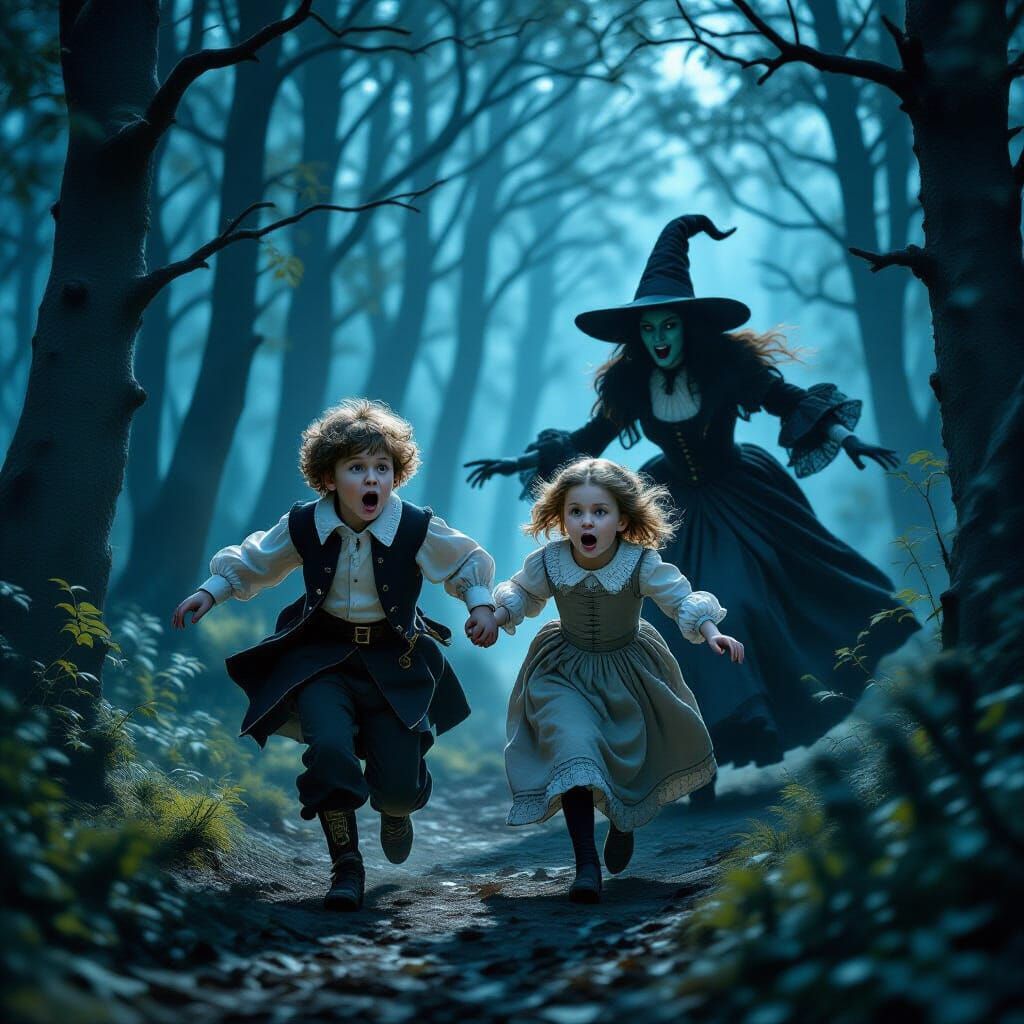This image shows two children in period clothing running from a menacing witch in a dark forest. The scene is rendered in detailed 3D with dramatic lighting, in a dark fantasy aesthetic.