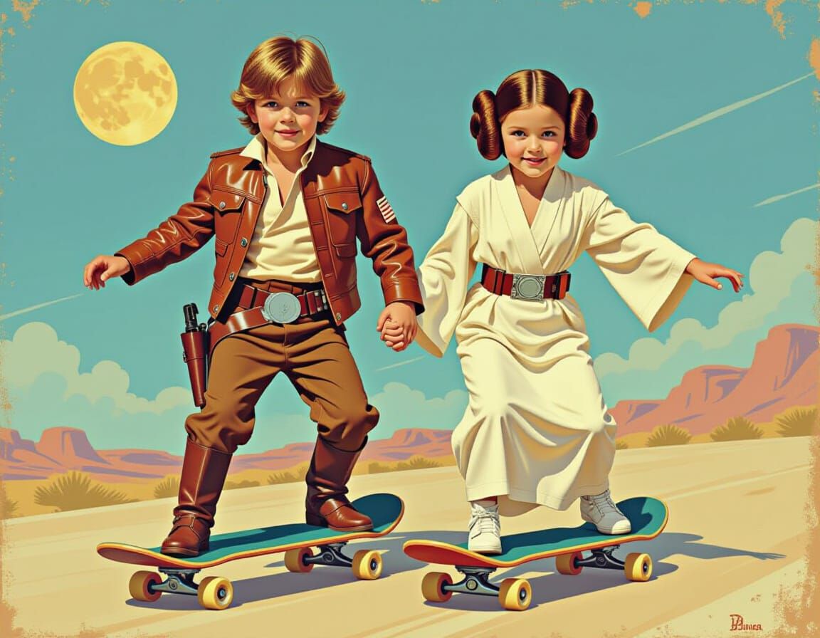 This image shows a boy dressed as Han Solo and a girl dressed as Princess Leia on skateboards. The artwork is in a retro-futuristic style, reminiscent of pin-up art and colorful, stylized storytelling.