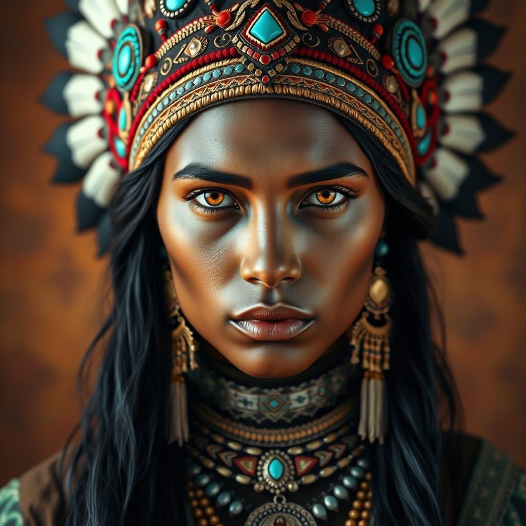 This image shows a stunning, close-up portrait of a Native American woman with deep brown skin and long black hair, adorned with an ornate headdress featuring turquoise, red, and gold accents. Set against a warm, richly colored background, she exudes cultural and historical significance with a majestic, ...