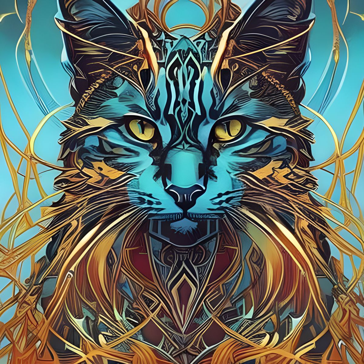 A striking picture of three majestic Norwegian Forest Cats. The artwork is highly detailed with a triadic color scheme, resembling breathtaking cover art.