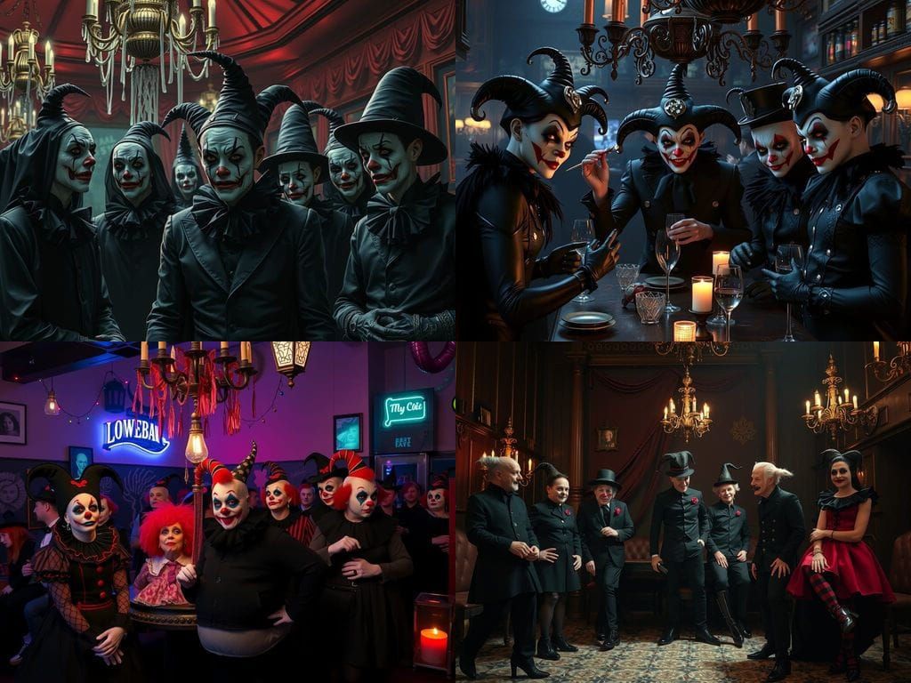 Design your own darkly humorous goth clown scenes with our free AI image generator.