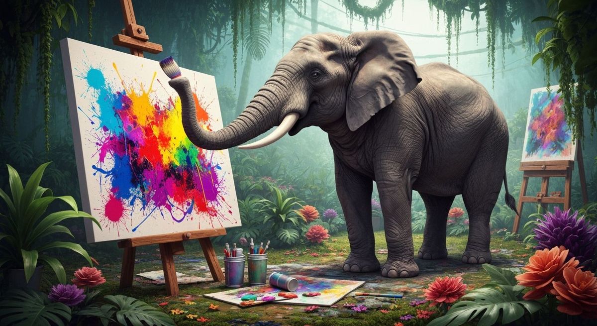 This image shows an elephant artist painting abstract art in a lush jungle studio. The art style features graffiti, splash art, and melting gouache textures with high contrast and vibrant colors.