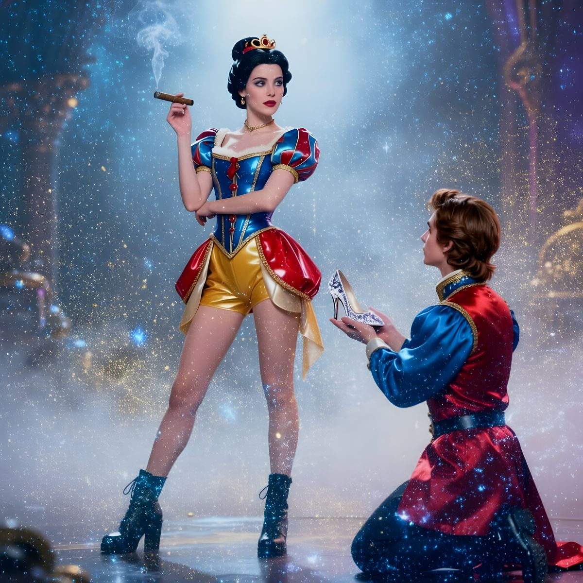 A striking image of a confident woman in a glossy latex fairy tale dress, holding a cigar. A shy prince kneels before her, offering a crystal shoe. Fantasy art with ethereal mist background.