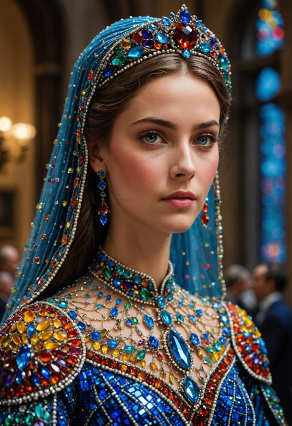 This image showcases a full-body portrait of a beautiful brunette princess adorned in multicolored glass beads, a long train, and blue glass slippers. Rendered with volumetric lighting and sharp focus, it features intricate details and tetradic colors in a photorealistic style.