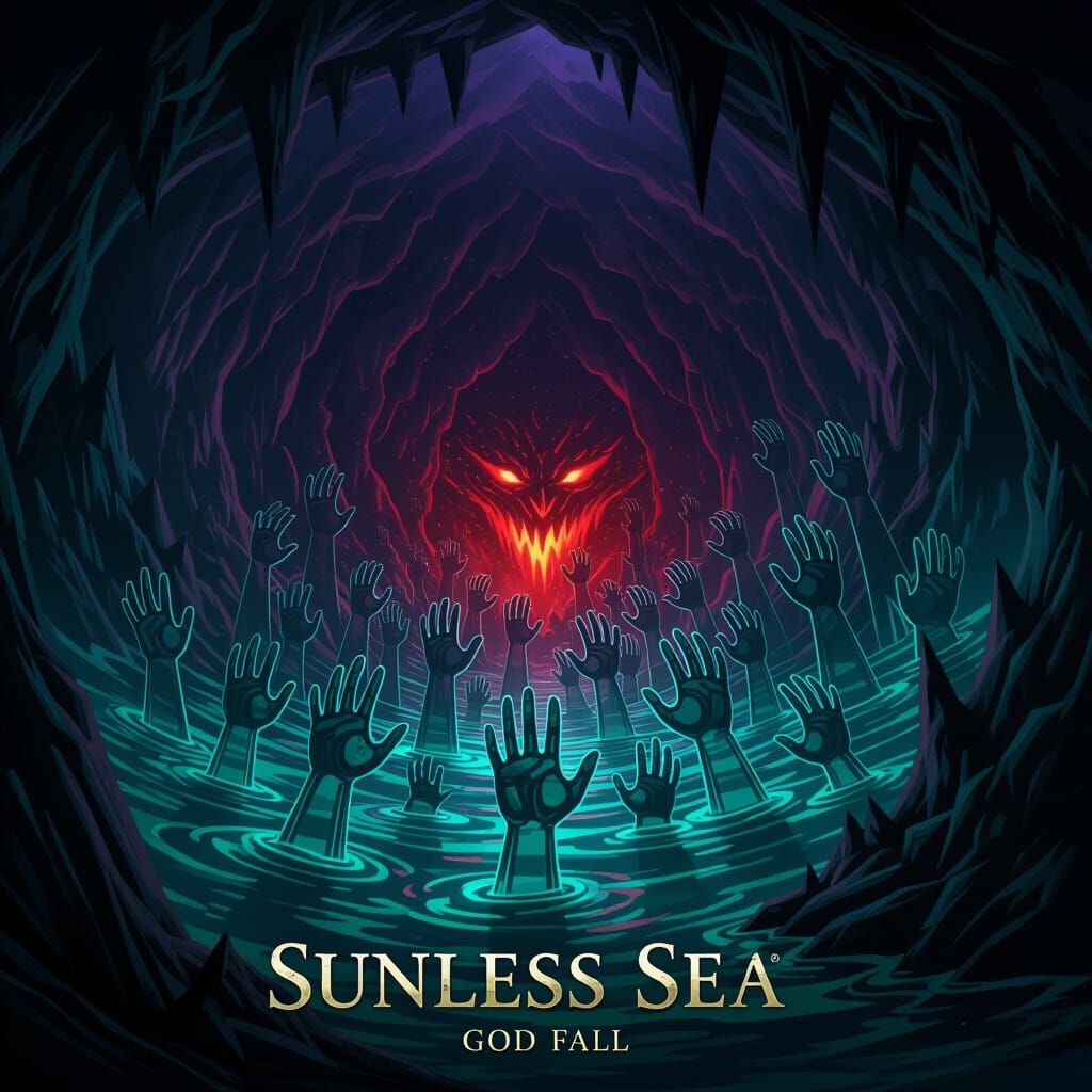 This dark fantasy concept art depicts a vast cavern, the Sunless Sea, with glass statue hands emerging from murky waters, lit by an evil red glow. Features hyperdetailed, volumetric lighting, splashes of purple and yellow, and a stunningly realistic Unreal Engine render.