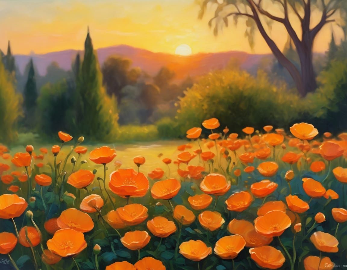 This image captures a serene garden scene at sunset, with vibrant orange Persian buttercups and warm golden light dancing across the scenery, evoking a sense of gentle tranquility reminiscent of Impressionist masterpieces.