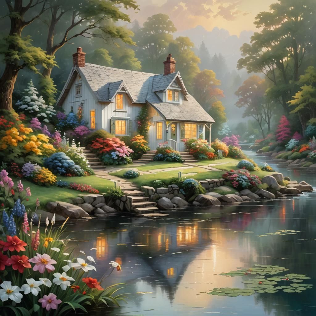 A picturesque view of a quaint white cottage by a peaceful river, bathed in soft, warm light. This enchanting scene evokes a dreamy, idyllic atmosphere with hyper-detailed oil painting textures.