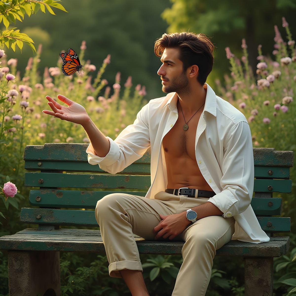 A sunny image of a man in an English garden with a monarch butterfly. The man sits barefoot on a bench, smiling as the butterfly approaches his outstretched hand.