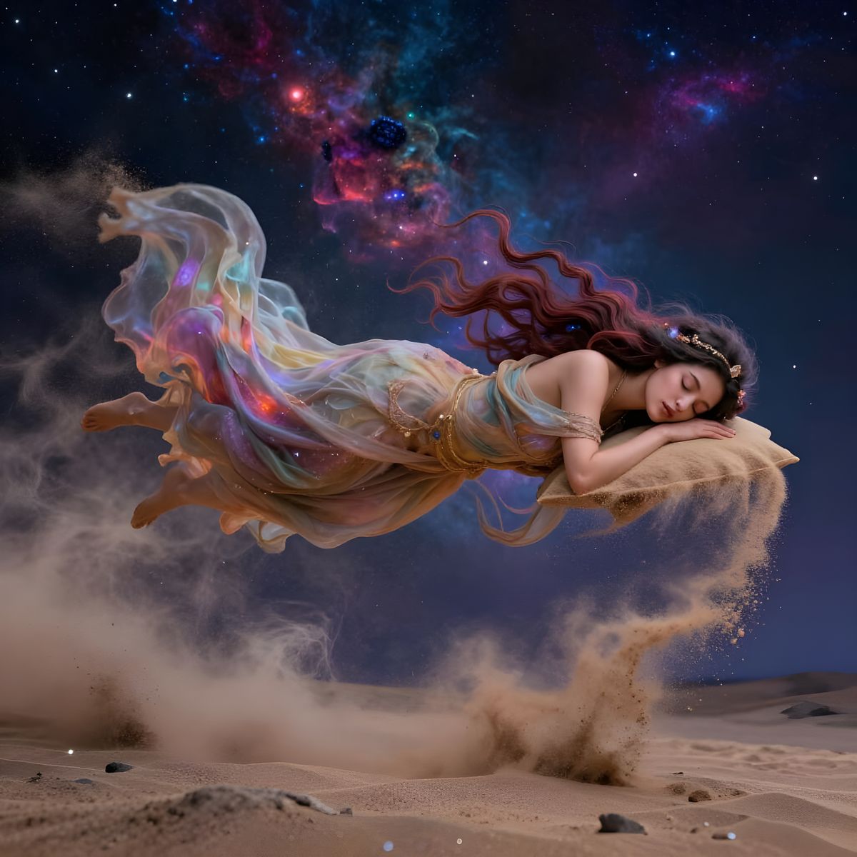 This image depicts a multicultural midnight goddess, a mythical bringer of dreams. She is shown sprinkling enchanted sands and blowing them across a landscape, symbolizing slumber and sleep.